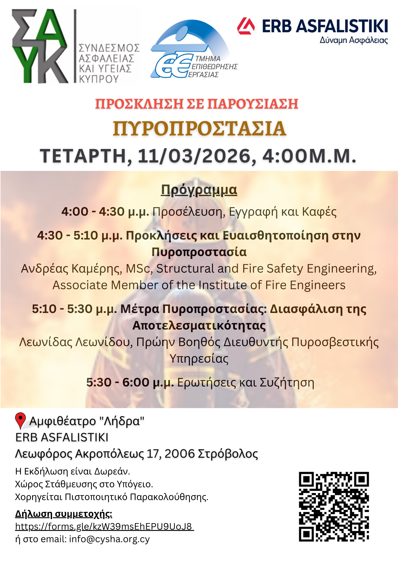 Το Διοικητικό Συμβούλιο του Συνδέσμου Ασφάλειας και Υγείας Κύπρου, σας προσκαλεί να παρακολουθήσετε παρουσίαση με θέμα «Πυροπροστασία» την Τέταρτη, 11 Μαρτίου 2026 και ώρα 04:00μ.μ. στο αμφιθέατρο "Λήδρα" στην ERB ASFALISTIKI, Ακροπόλεως 17, 2006, Στρόβολος, Λευκωσία.